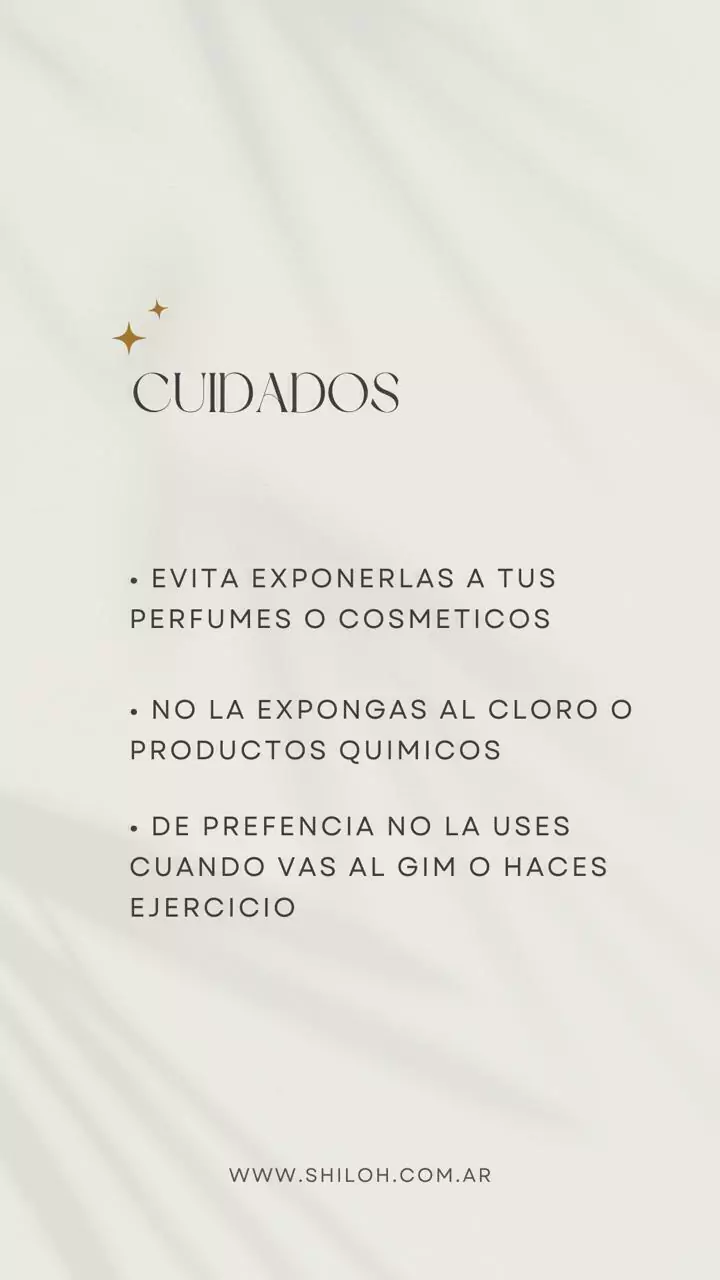 SE RECOMIENDA EVITAR MOJARLO O PONERLO EN CONTACTO CON PRODUCTOS QUÍMICOS COMO JABONES, PERFUMES O CREMAS, PARA EVITAR QUE CAMBIEN DE COLOR. ESTE MATERIAL NO TIENE GARANTÍA YA QUE SI NO SE SIGUEN LAS IDICACIONES ANTERIORES PUEDE TORNARSE AMARILLENTO SI SON PLATEADOS, O COLOR COBRE SI SON DORADOS.