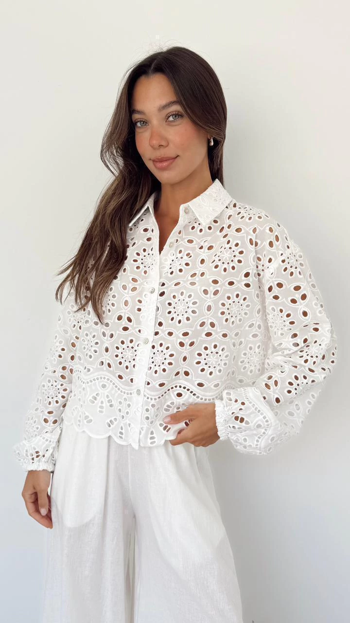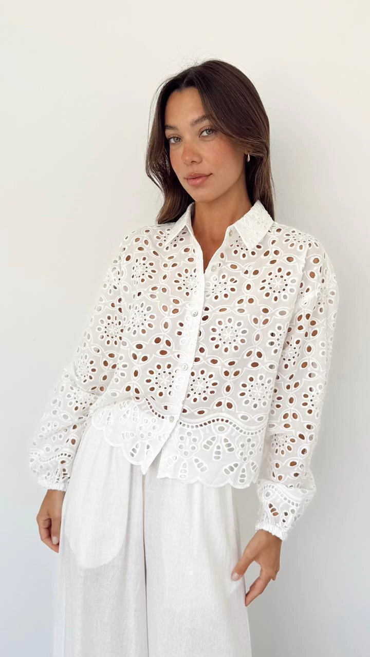 Te presentamos nuestra camisa Lubroe confeccionada en broderie con diseño de flores. Su acceso es por medio de sus botones nacarados en el frente. Tiene cuello solapa y mangas largas con puño elastizado. Es de corte amplia y larga hasta la cadera con terminacion irregular en ondas.
