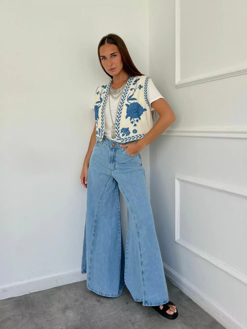 Nuestro Jean Sendai es de calce palazzo tiro alto. Rígido color azul. Costuras en azul y avíos en oro italiano. Es un jean super original usalo con tu calzado favorito y te vas a destacar
