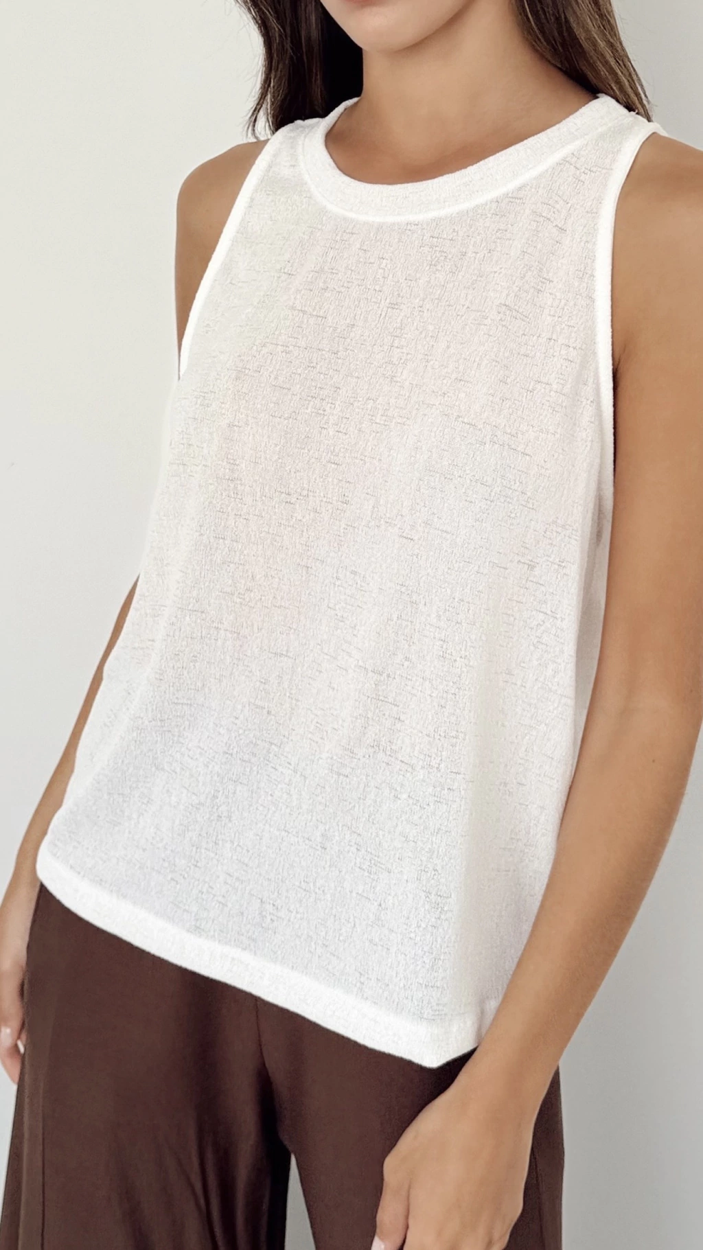 Te va a encantar nuestra musucola Panice blanca tejida con trama cerrada. Es amplia con cuello redondo. Su largo a la cadera con terminacion al rases ideal para usar con nuestros pantalones palazzo o jeans.