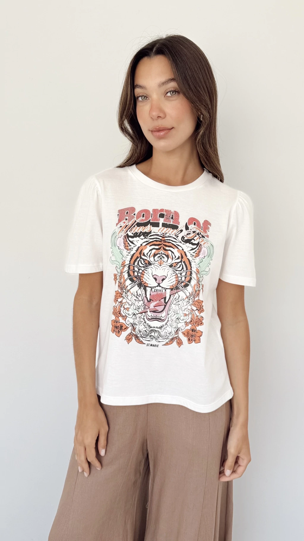 Nuestra Remera Born  esta confeccionada en algodon premium con un estampado con diseño de cara de tigre y frase estilo rockera born of waves and fire en distintos colores. Su corte es recto y muy comodo. Presenta mangas tipo princesa.  Es un clasico de la marca de " st marie , por su calidad y originalidad. Combinala con tus pantalones o short favoritos esta temporada .