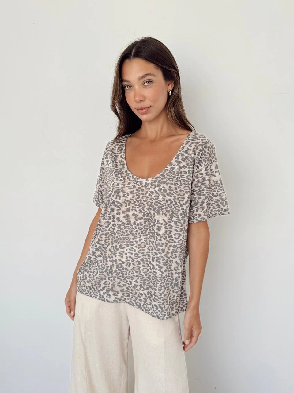 Nuestra remera Leonis confeccionada en rustico con estampa animal print es un basico para usar siempre en tus looks. De escote en U profundo, tiene mangas cortas amplias. Su corte ancho y largo hasta por debajo de la cadera ter permite estar comoda siempre. En la espalda tiene logo en eco cuero. Usala con nuestros skorts y tus sandalias preferidas.