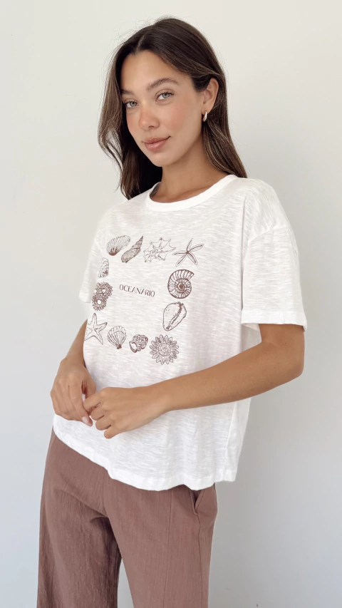 Te va a encantar nuestra remera Oceanario confeccionada en algodon flame con estampa en el frente con diseño de caracoles, estrella de mar. Tiene mangas cortas anchas que te permite estar comoda todo el tiempo. Su corte es recto y largo a la cadera. Una prenda muy comoda y fresca para usar con nuestros jeans y shorts.