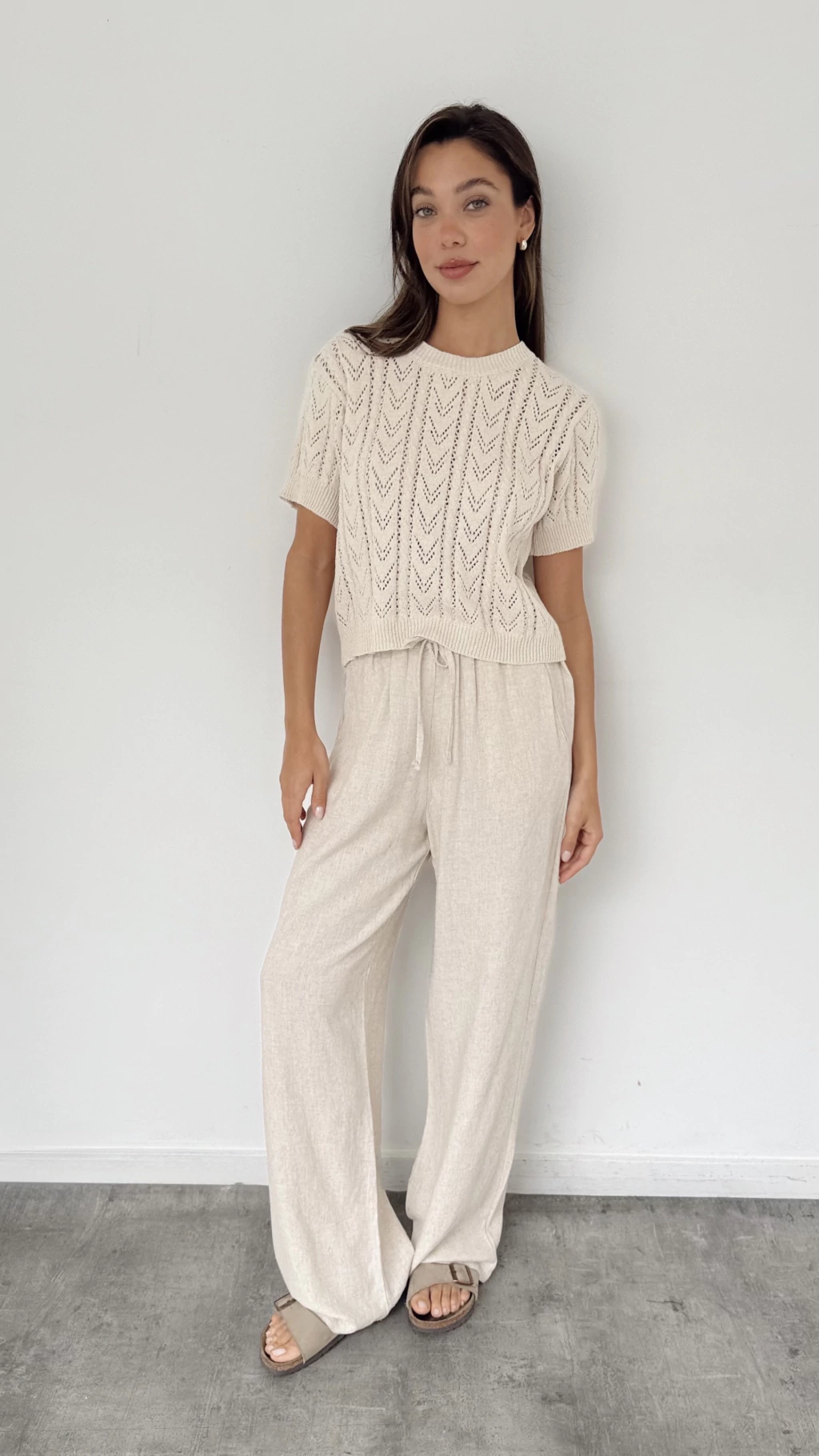 Nuestra remera Saorei tejida con diseño calado en V es una prenda super canchera. Tiene escote redondo tejido, mangas cortas con puño tejido tipo espiga. Es ancha y larga hasta la cadera. Usala con nuestros short de jean o skorts de lino para un outfit casual.