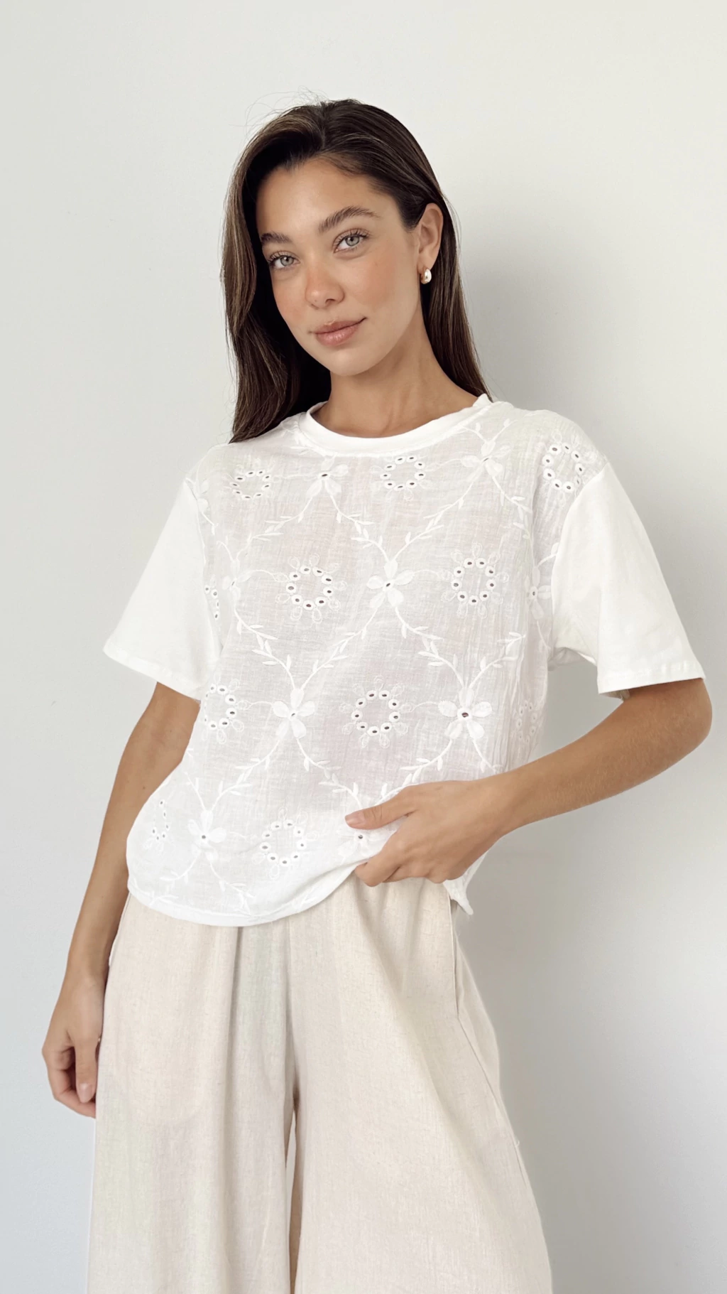 Te presentamos nuestra remera Yusufer confeccionada en broderie y jersey de algodon. Tiene un diseño unico en el frente con dibujo de flores, en la espalda es lisa. Su cuello es redondo y sus mangas son cortas. Es de corte ancha y larga hasta la cadera. Combinala con nuestro jean oxford Aydin y tus zapatillas preferidas para un look urbano y canchero.