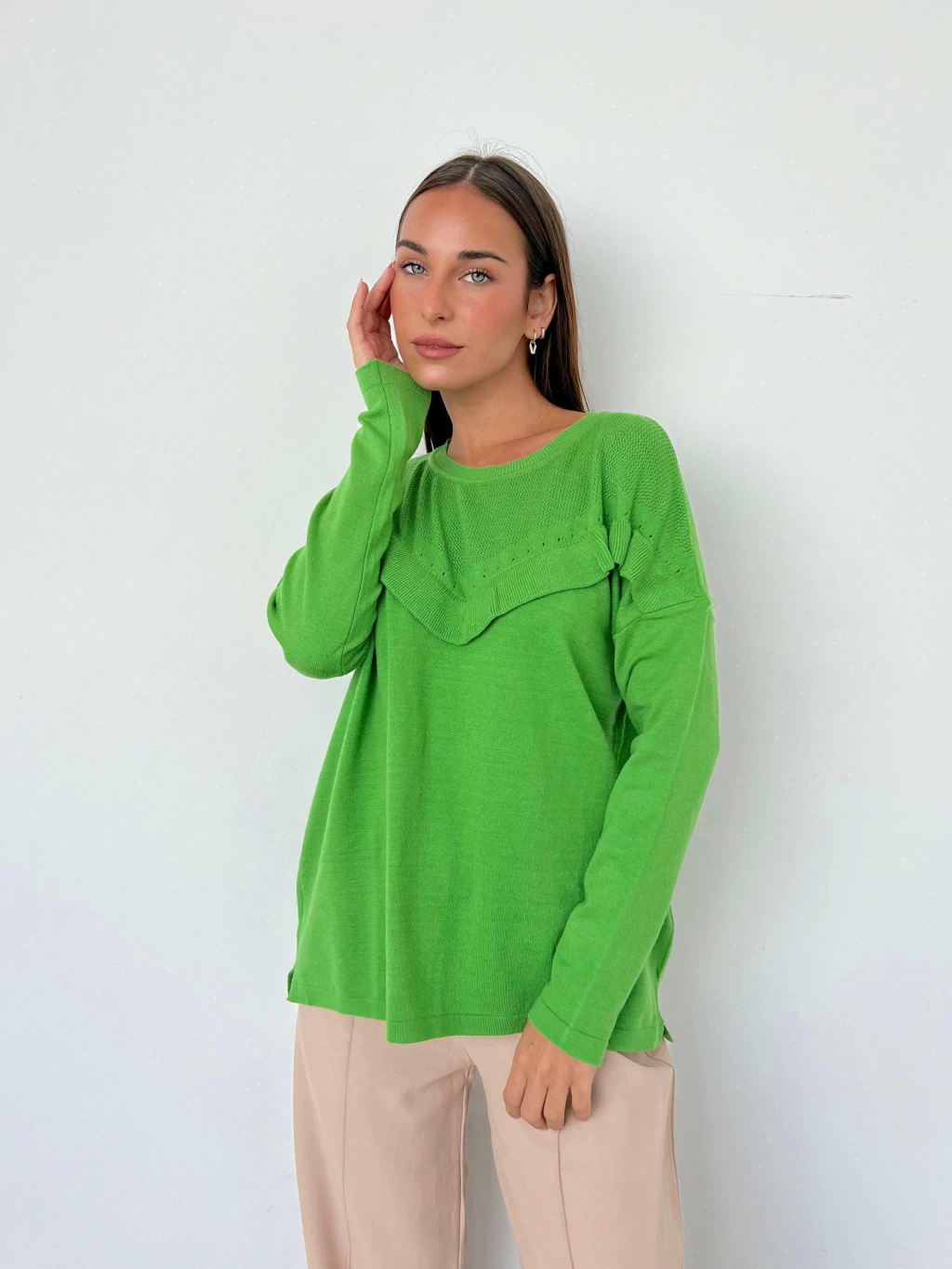 El sweater Andonni esta confeccionado en bremer, un hilado super suave al tacto y muy confortable. El volado en su frente le da un toque único y romantico. Con escote redondo y hombro caido. Tiene un look muy classy que queda divino con todo. Es largo a la cintura lo hace super versatil, perfecto para combinar con jeans, pantalones sastreros y faldas. Una prenda muy romantica!